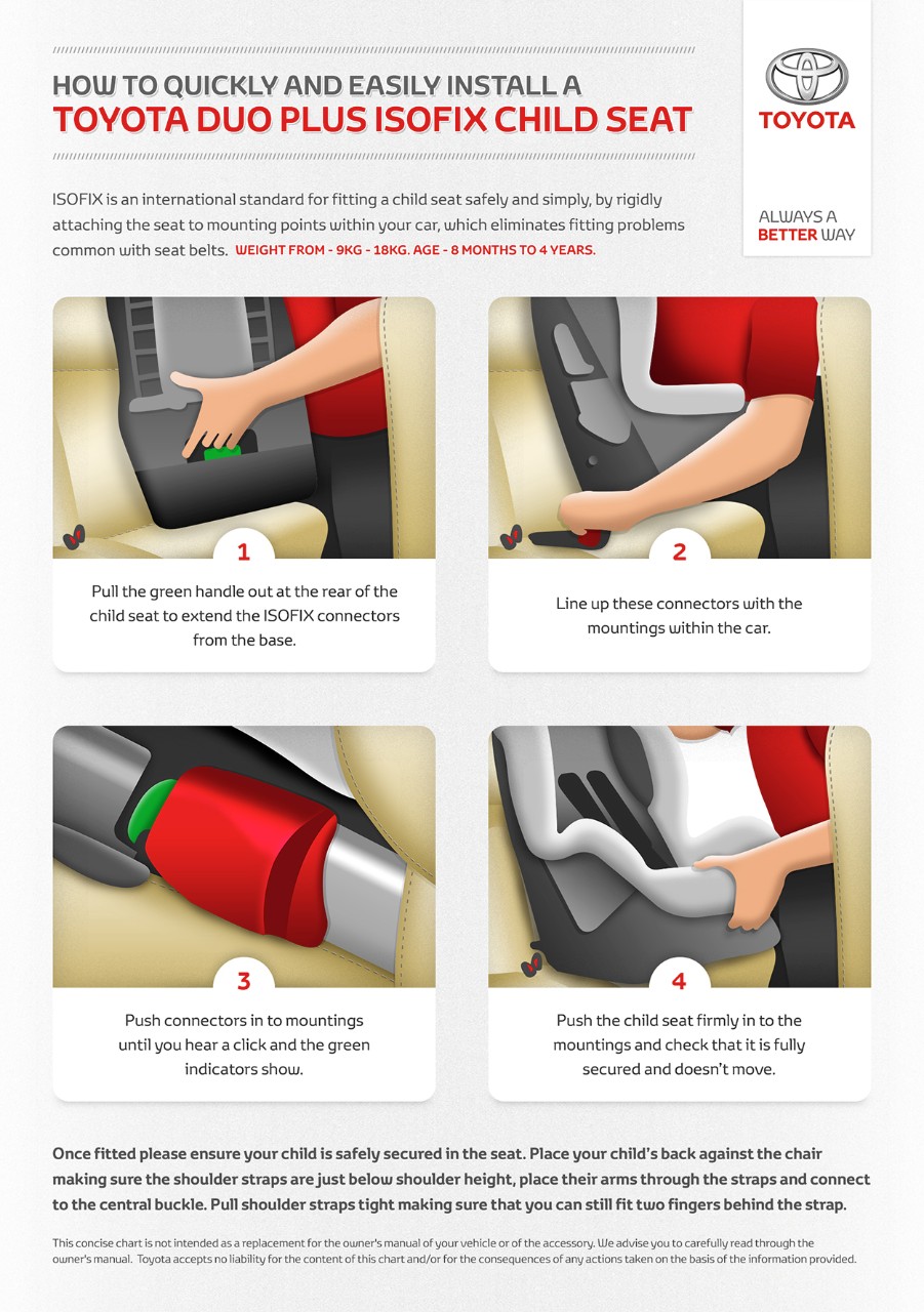 Fortunately Toyota offers a wide range of child car seats for all ages that incorporate the very best fixings and robust fabrics, and are designed for both comfort and safety.